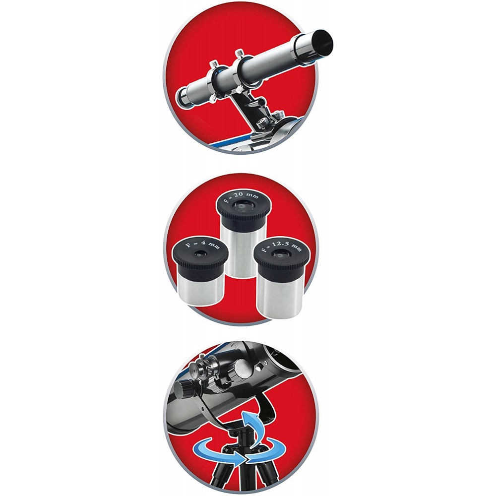 The telescope is mounted on a 76 cm metal tripod for stable and precise observations. Thanks to its stand, the telescope can rotate 360°. It has 3 eyepieces (20 mm, 12.5 mm and 4 mm) and a 76 mm lens that pushes the magnification up to 375 times for fine observation.