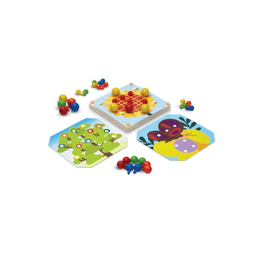 Includes a wooden board, 3 double-sided cards, and 50 colorful pegs in 2 different sizes.