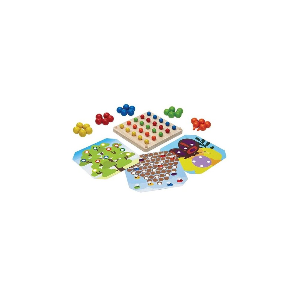 Créez votre propre chef-d'œuvre tout en affinant vos capacités motrices fines grâce à ce jeu de planche à chevilles en bois de Plan Toys. Le jeu comprend trois cartes double face et six motifs différents, ainsi que de nombreuses chevilles de deux tailles différentes pour une multitude de possibilités créatives !
