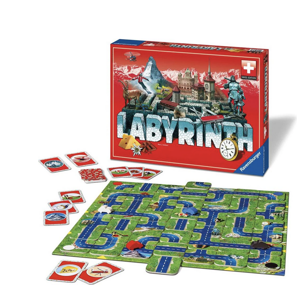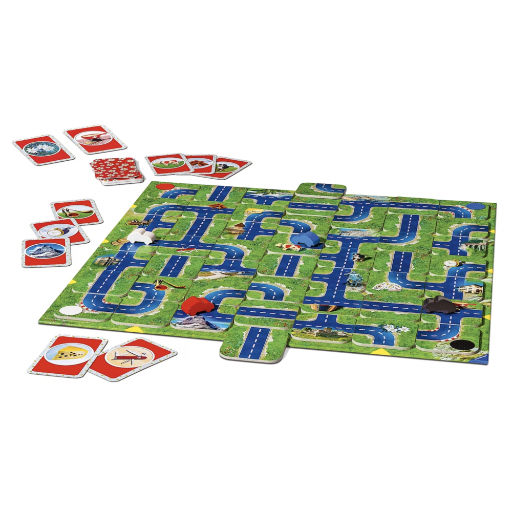 Déplacer des couloirs, déplacer des pions, chercher des trésors. Dans ce labyrinthe, les joueurs parcourent la Suisse en long et en large et découvrent des curiosités et des éléments typiques - des chutes du Rhin à l'accordéon schwytzois et de la fondue au Cervin.